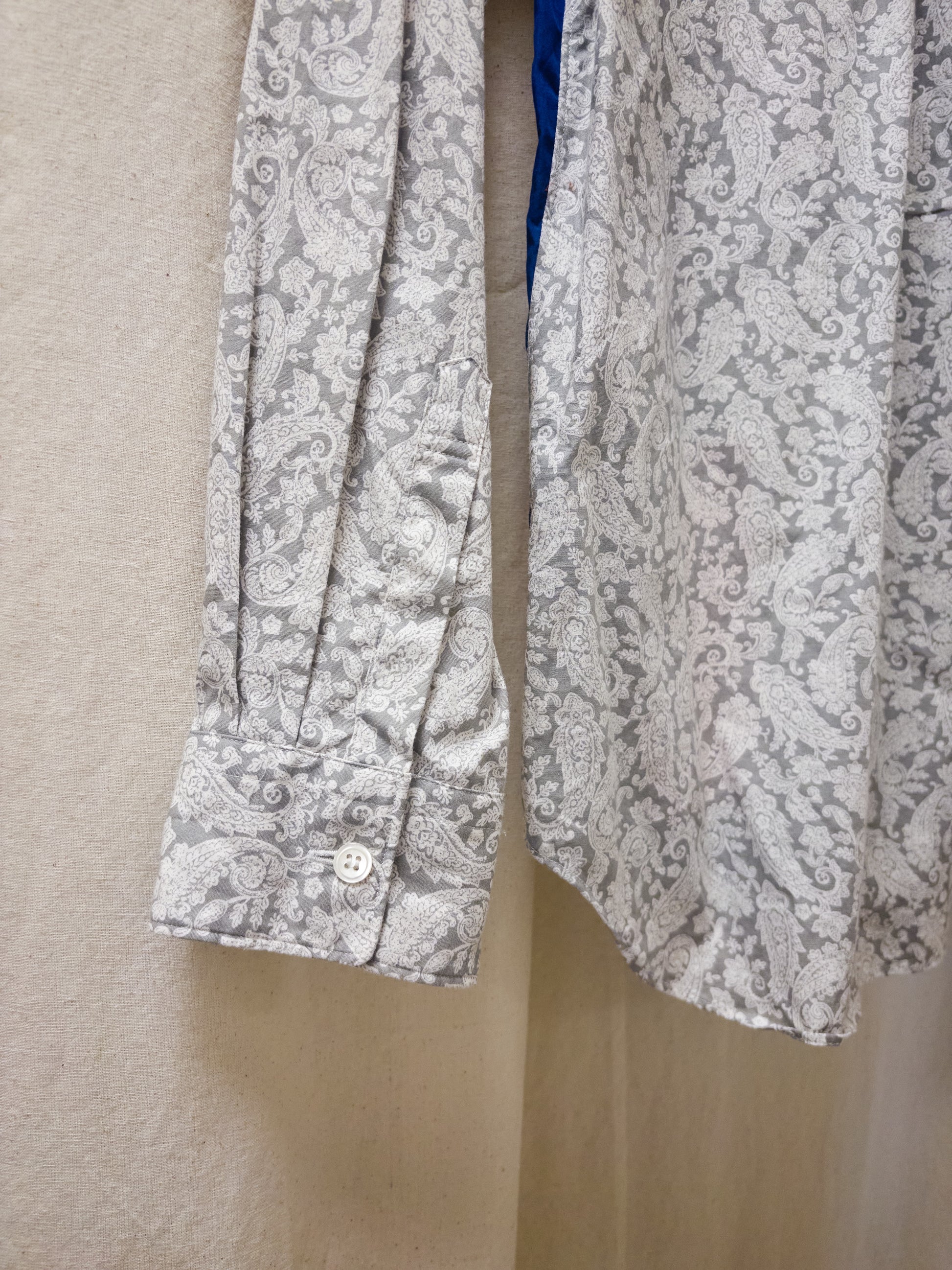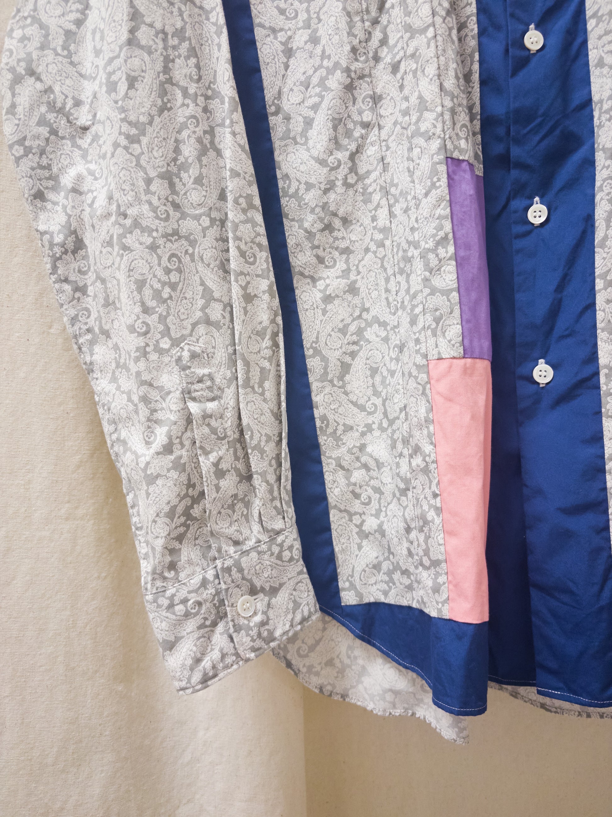 From Comme des Garcons Homme Deux, is this long sleeve shirt, with a paisley base, in a pink blue and purple patchwork. It has a window like quality with the front placket being blue and the sides a blue rectangular shape. There a small pink and purple patches on the front as well. The rear and sleeves are full paisley. It has buttoned cuffs.