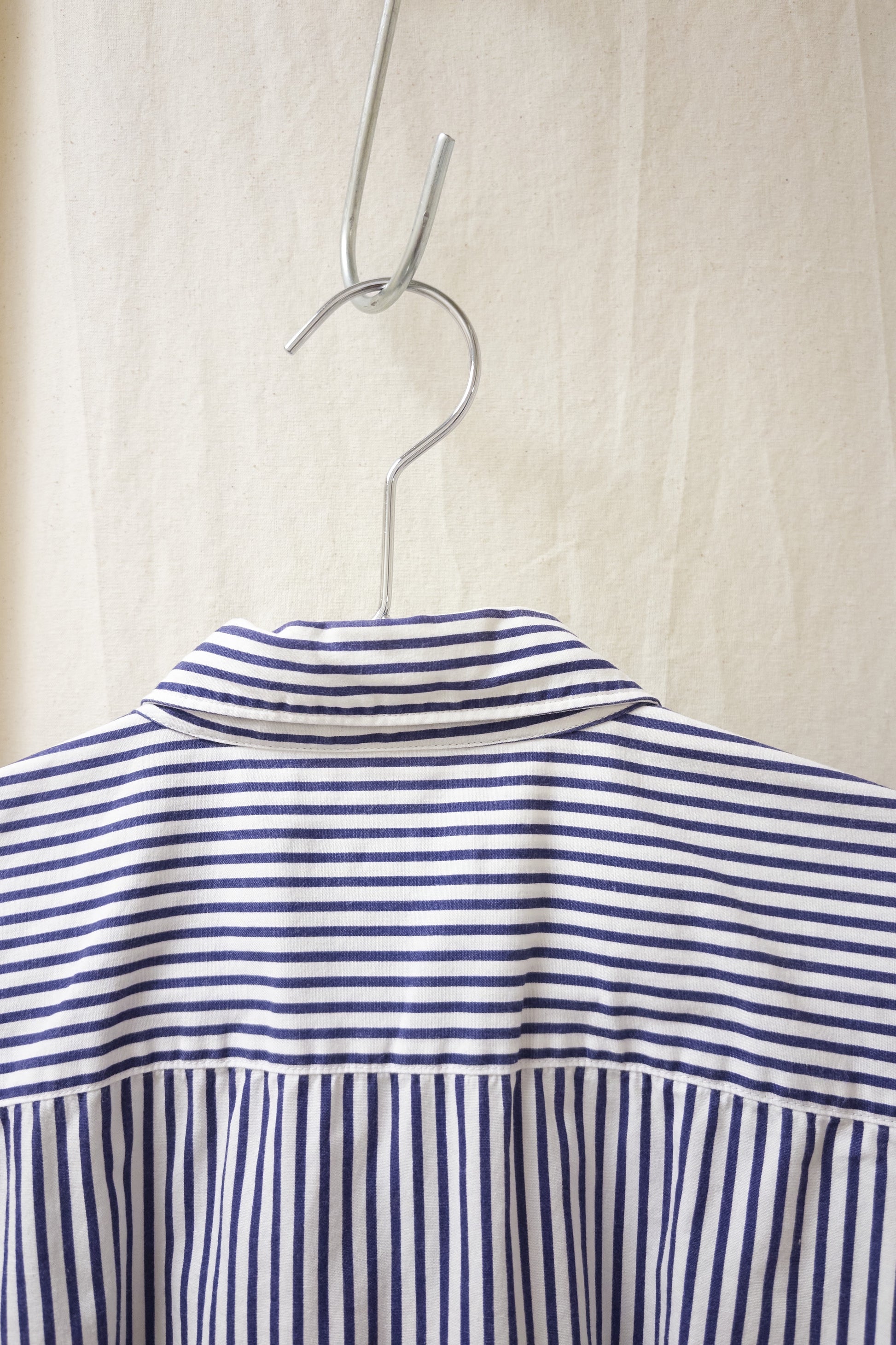 From Comme des Garcons Homme Plus, is this short sleeve striped shirt, featuring a bleach dip at the hem, turning the blue stripes into a faded stripe. It has a button down collar and boxy square shape.