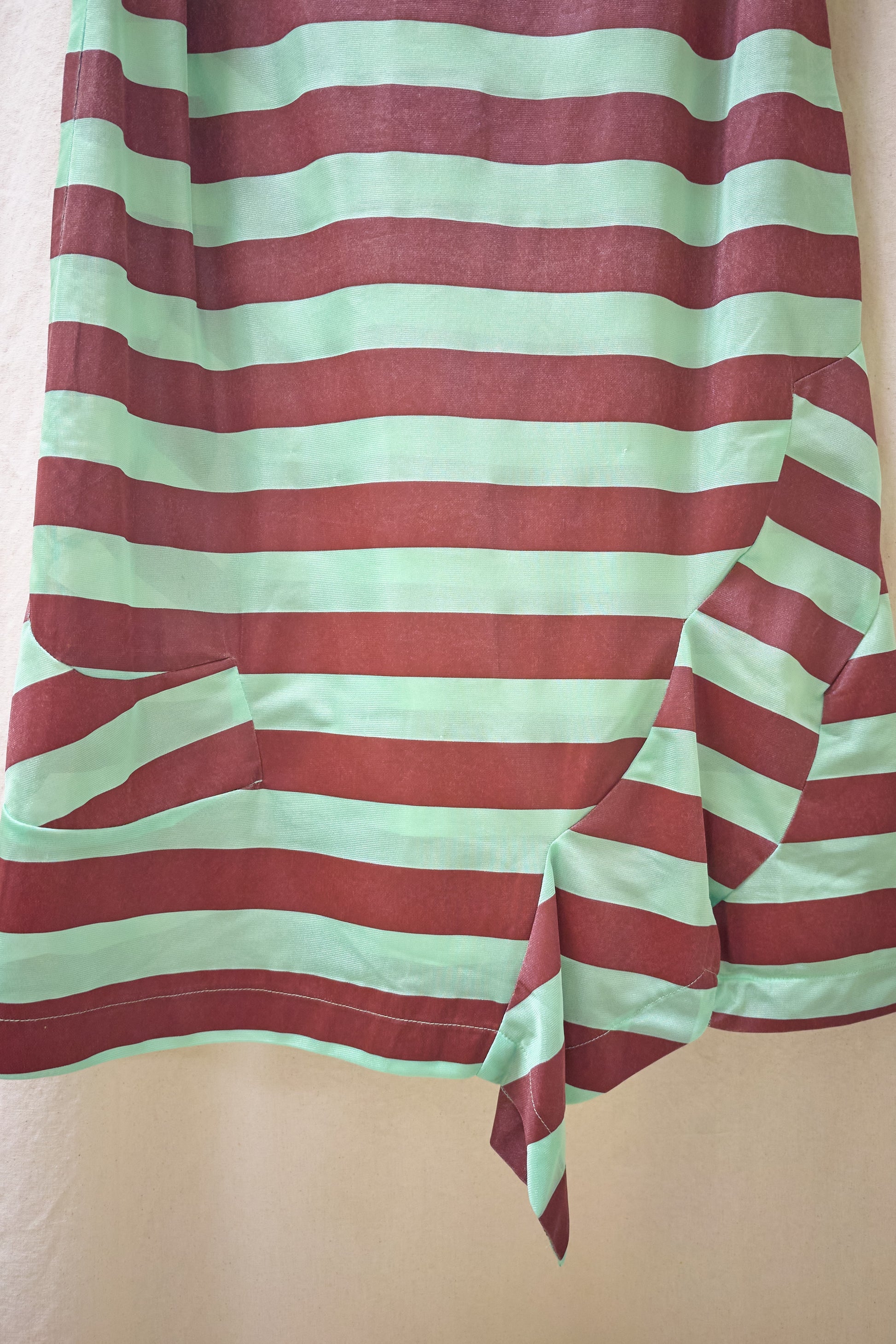 from Robe de Chambre Comme des Garcons is this lightweight semi-sheer polyester with a screen printed/painted burgundy stripe. It has wavy panels clashing with the horizontal stripe and hanging on the rear as pictured.