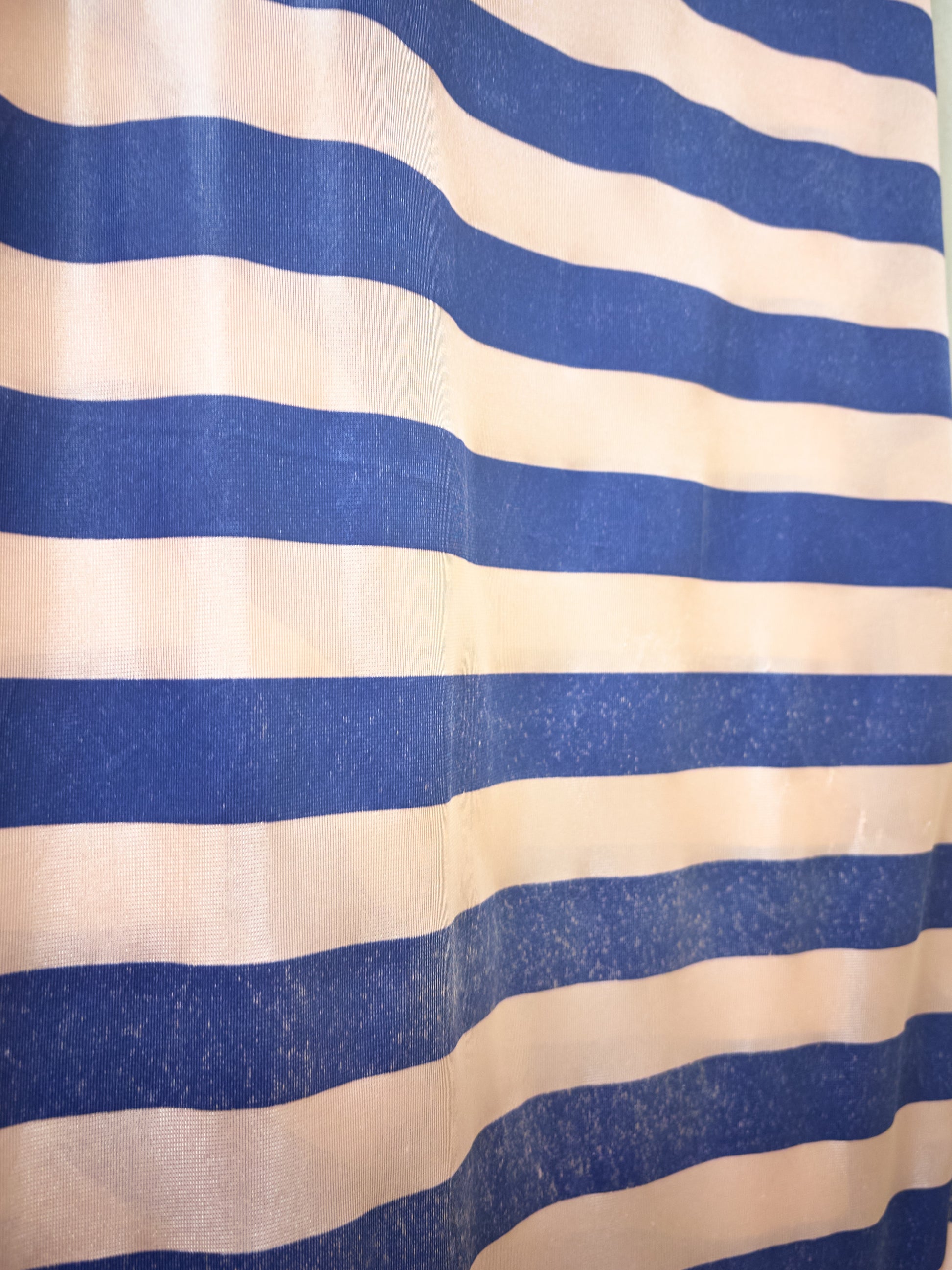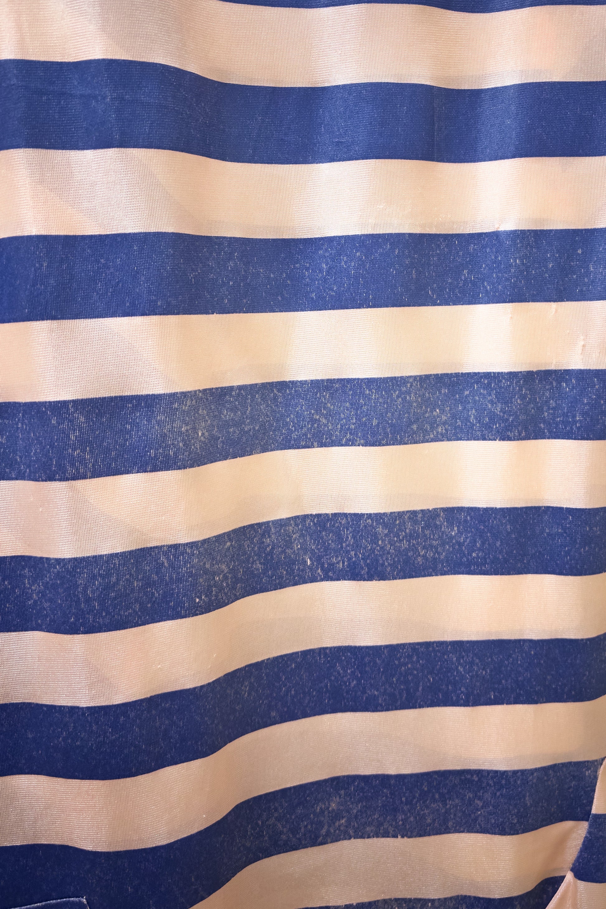 from Robe de Chambre Comme des Garcons is this lightweight semi-sheer polyester with a screen printed/painted blue stripe. It has wavy panels clashing with the horizontal stripe and hanging on the rear as pictured.