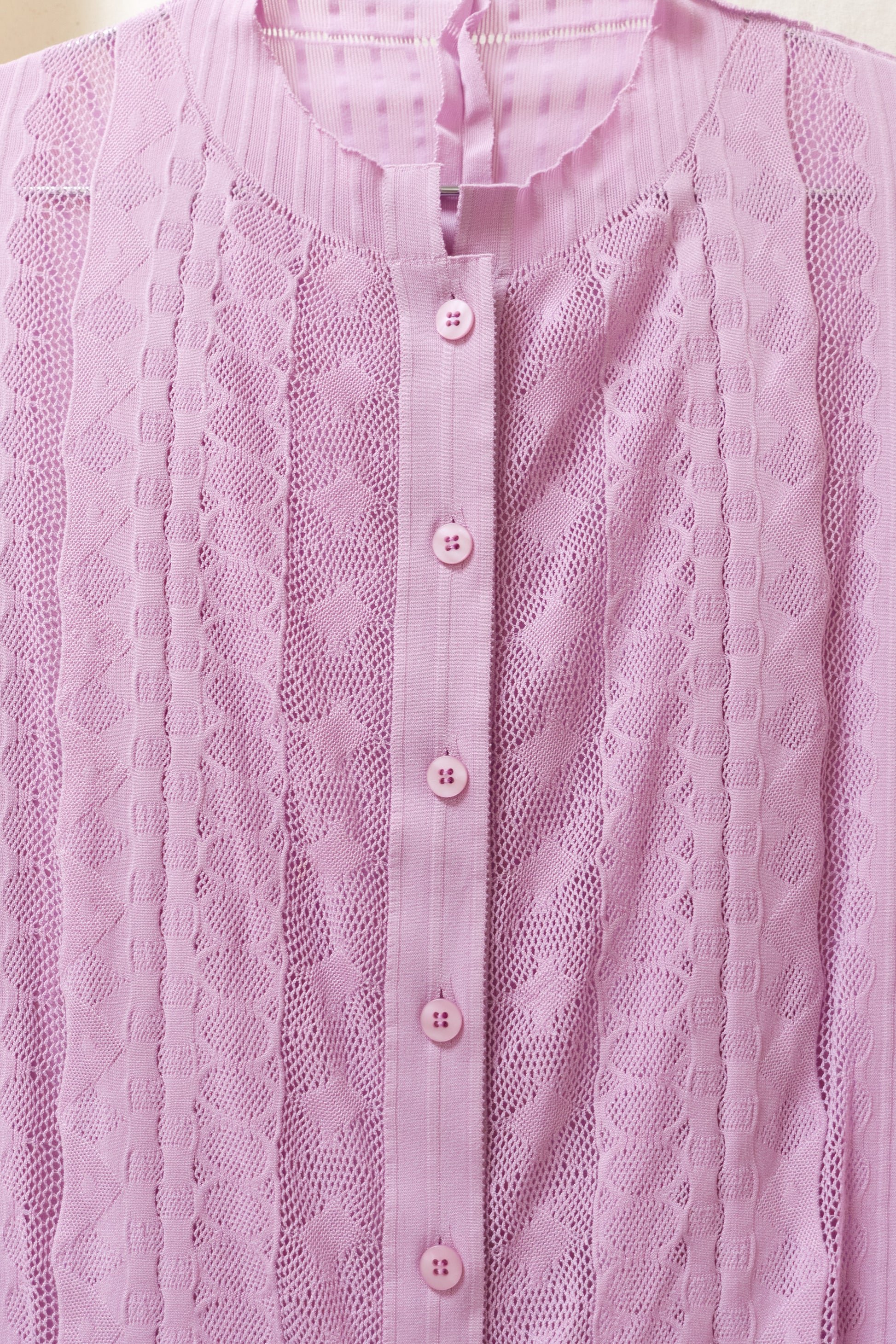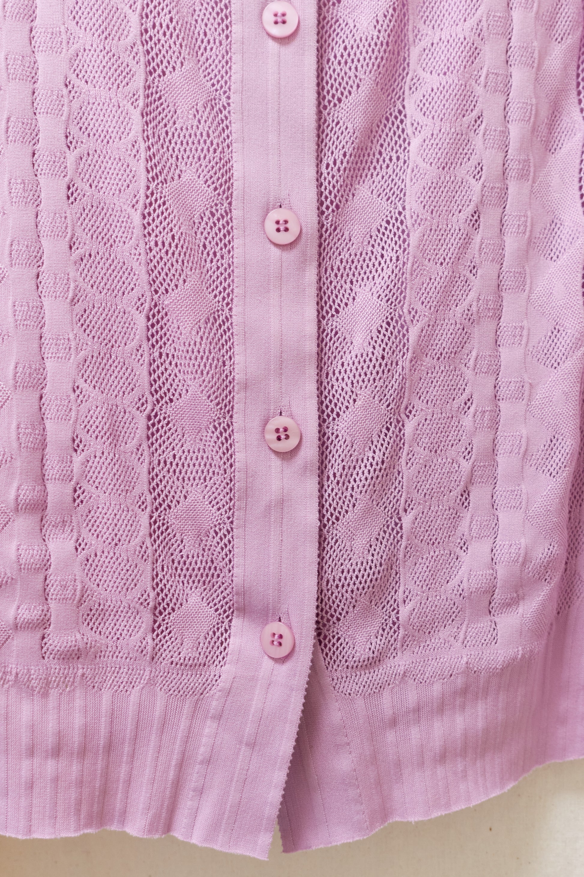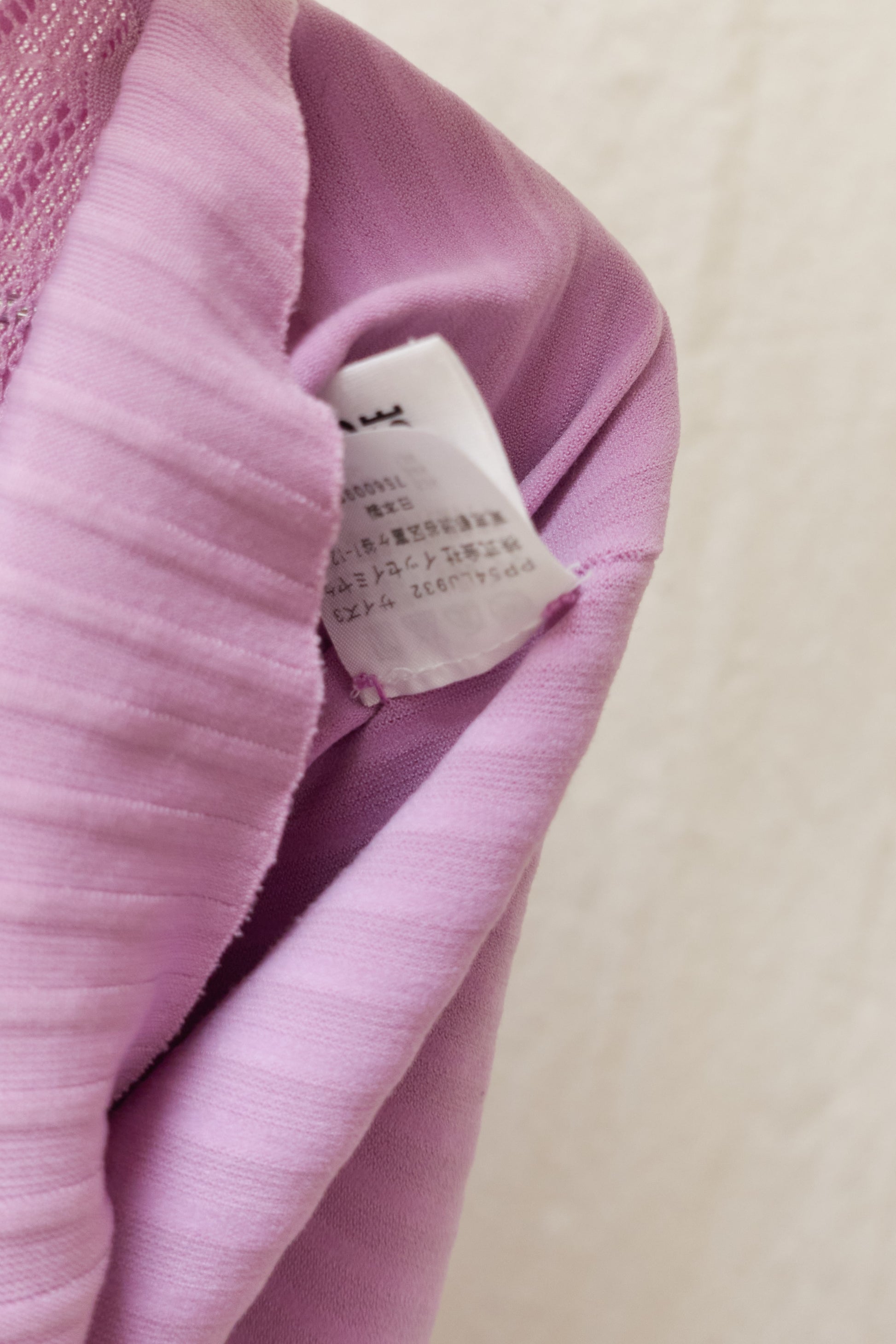 from Issey Miyake Fete/ A-POC is this lilac cardigan/long sleeve top with a lace like section woven into the cloth (as is often the case with A-POC garments) at the front. This motif is repeats at the cuffs. The fabric is very stretchy to fit the body. In excellent vintage condition with no faults to mention.
