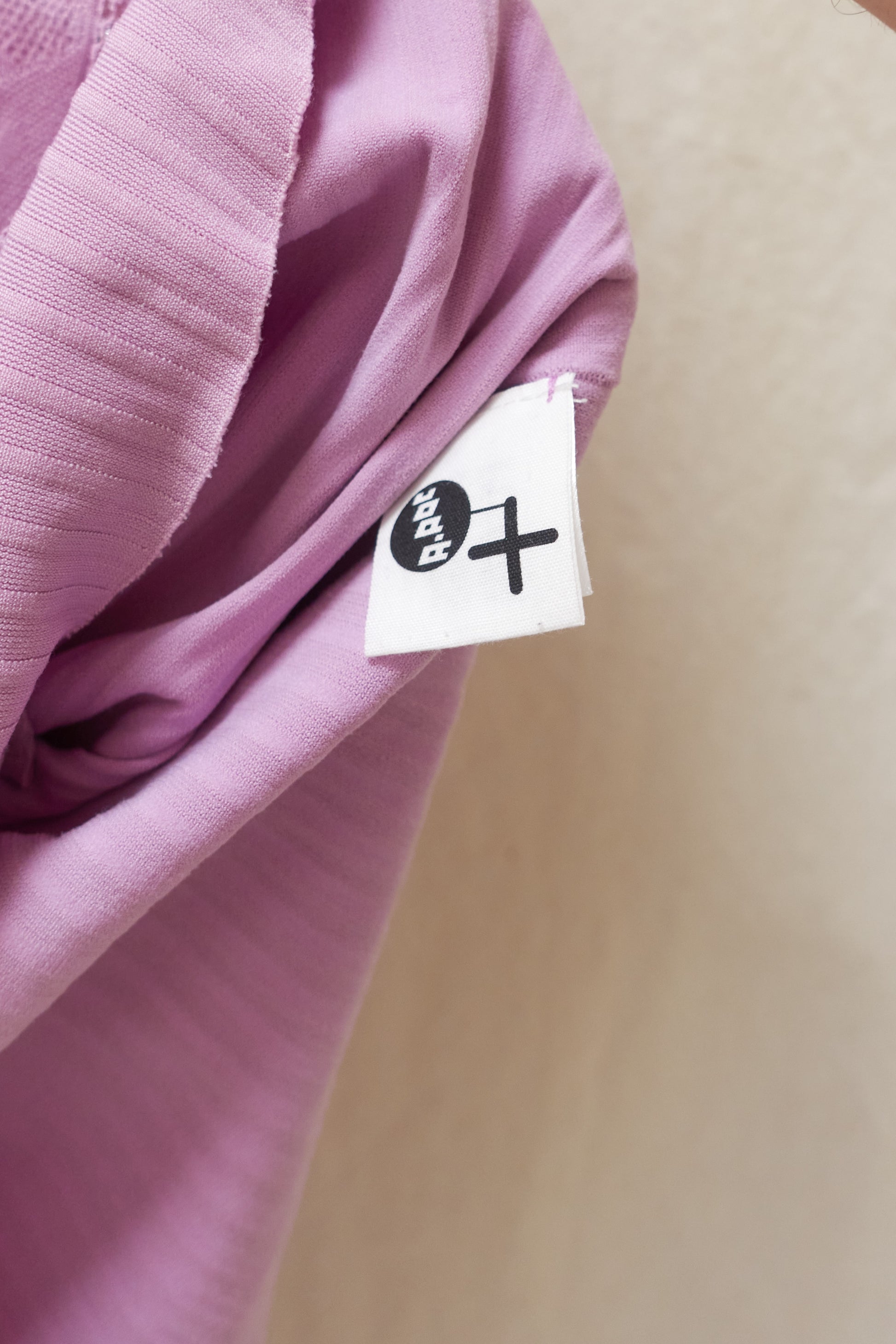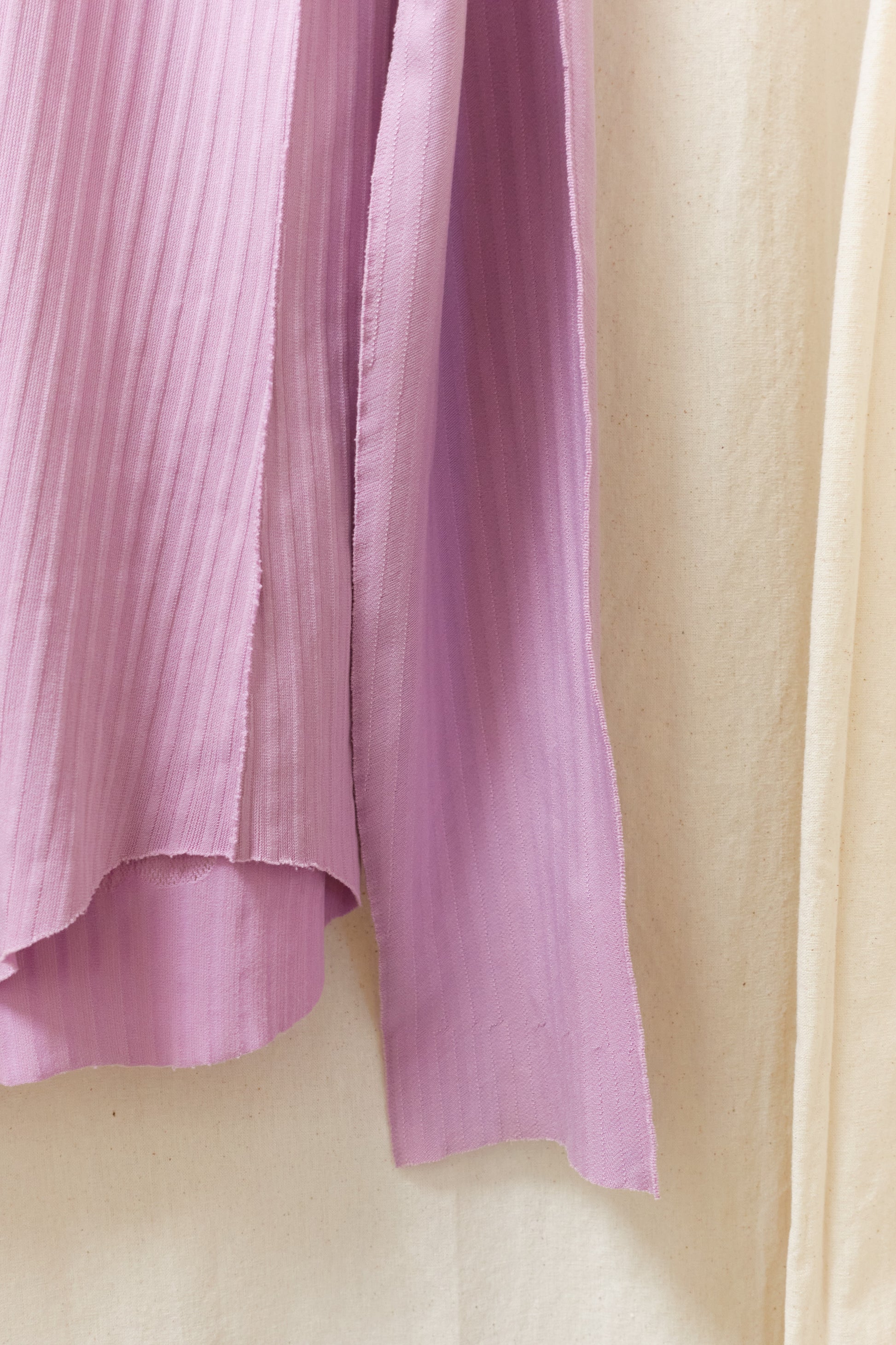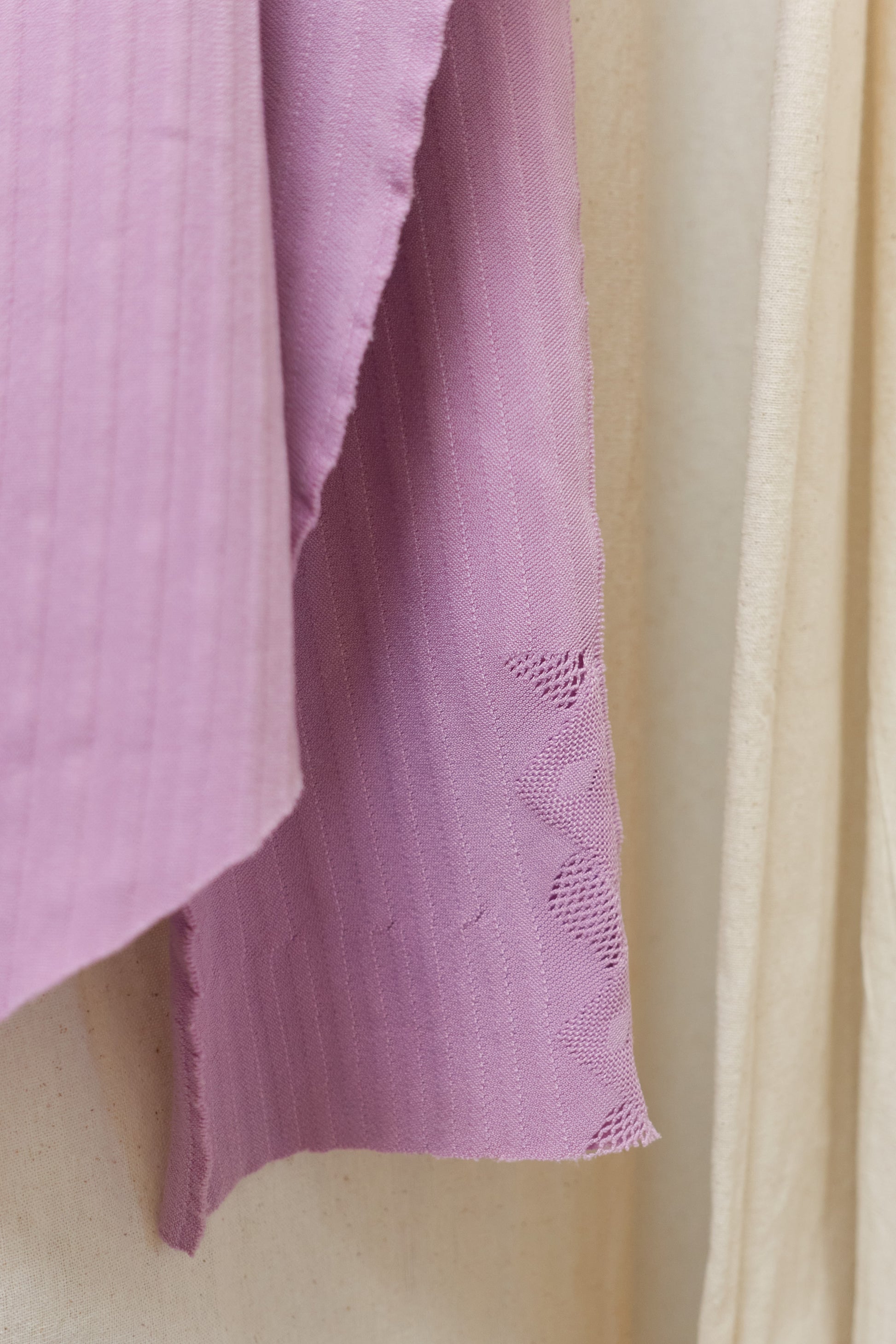 from Issey Miyake Fete/ A-POC is this lilac cardigan/long sleeve top with a lace like section woven into the cloth (as is often the case with A-POC garments) at the front. This motif is repeats at the cuffs. The fabric is very stretchy to fit the body. In excellent vintage condition with no faults to mention.