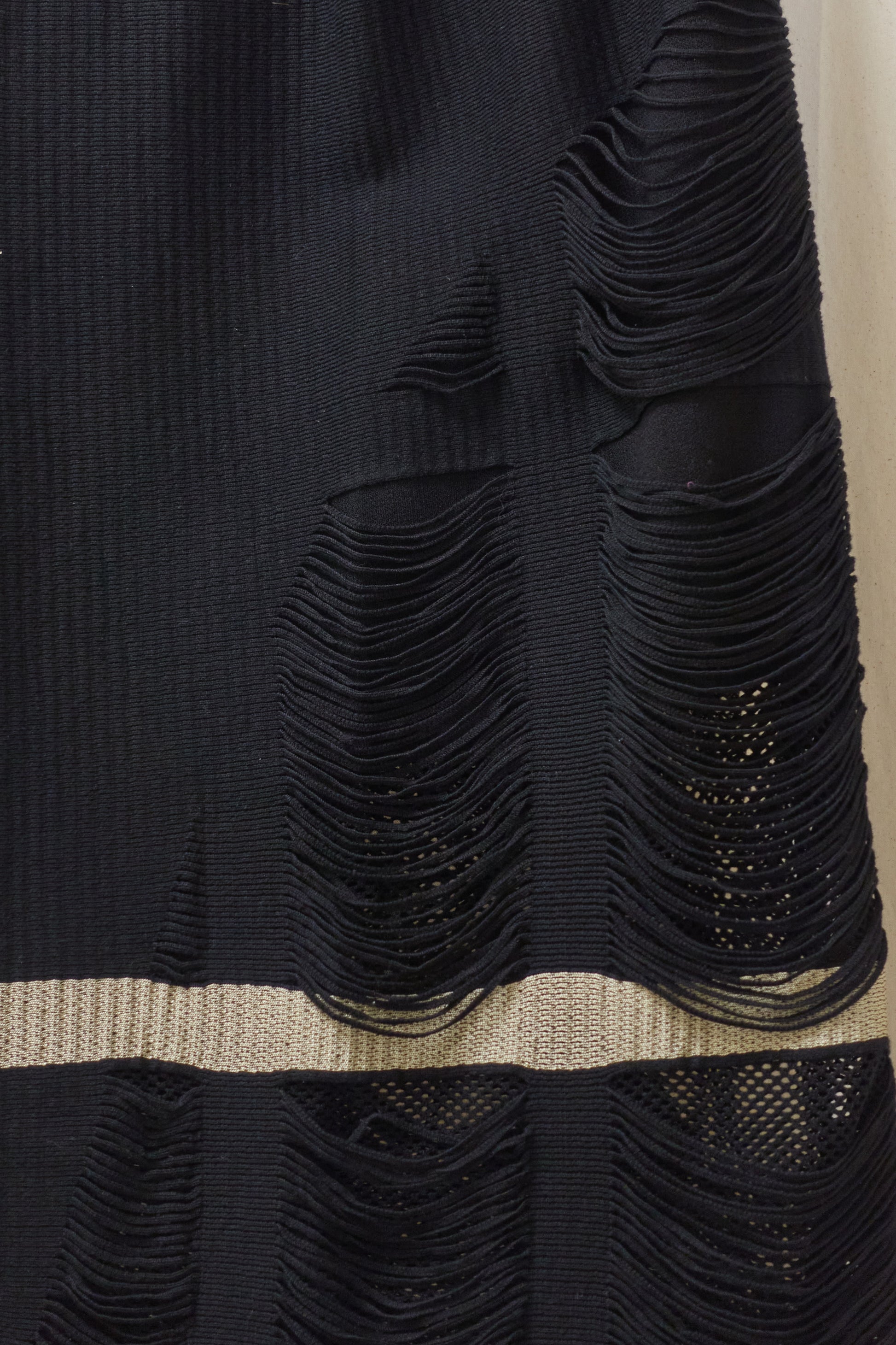 From Issey Miyake Fete/A.POC is this long skirt, with a dramatic fabric construction, with a look which is almost unravelling in sections. It has a bold gold horizontal stripe aswell.