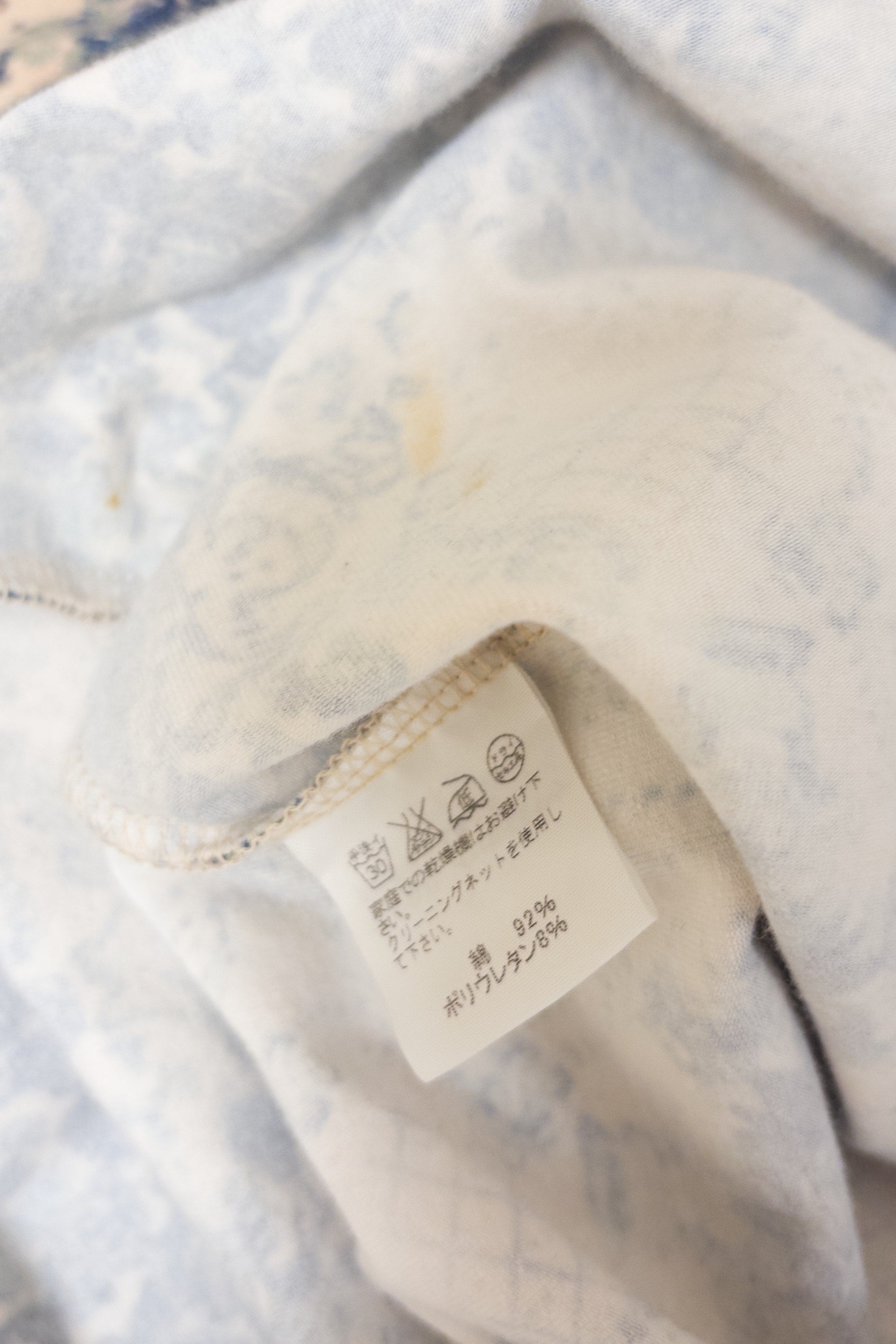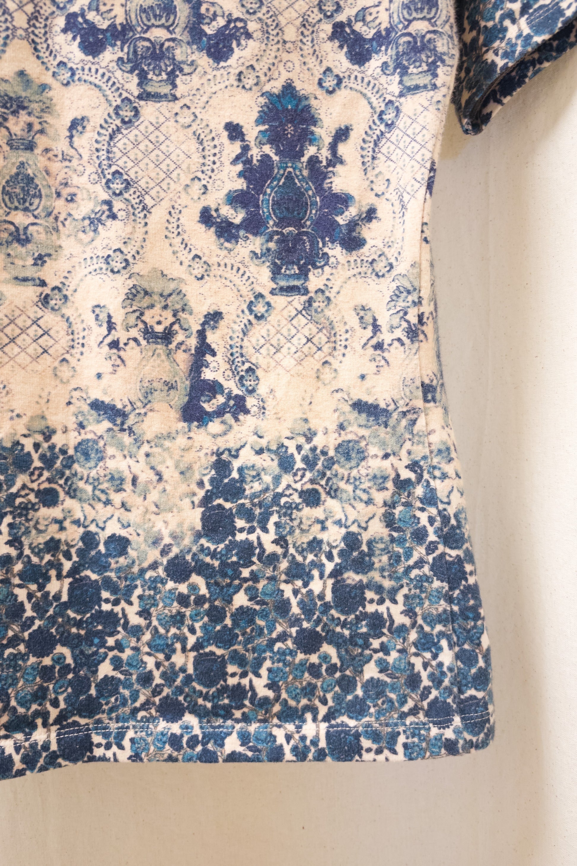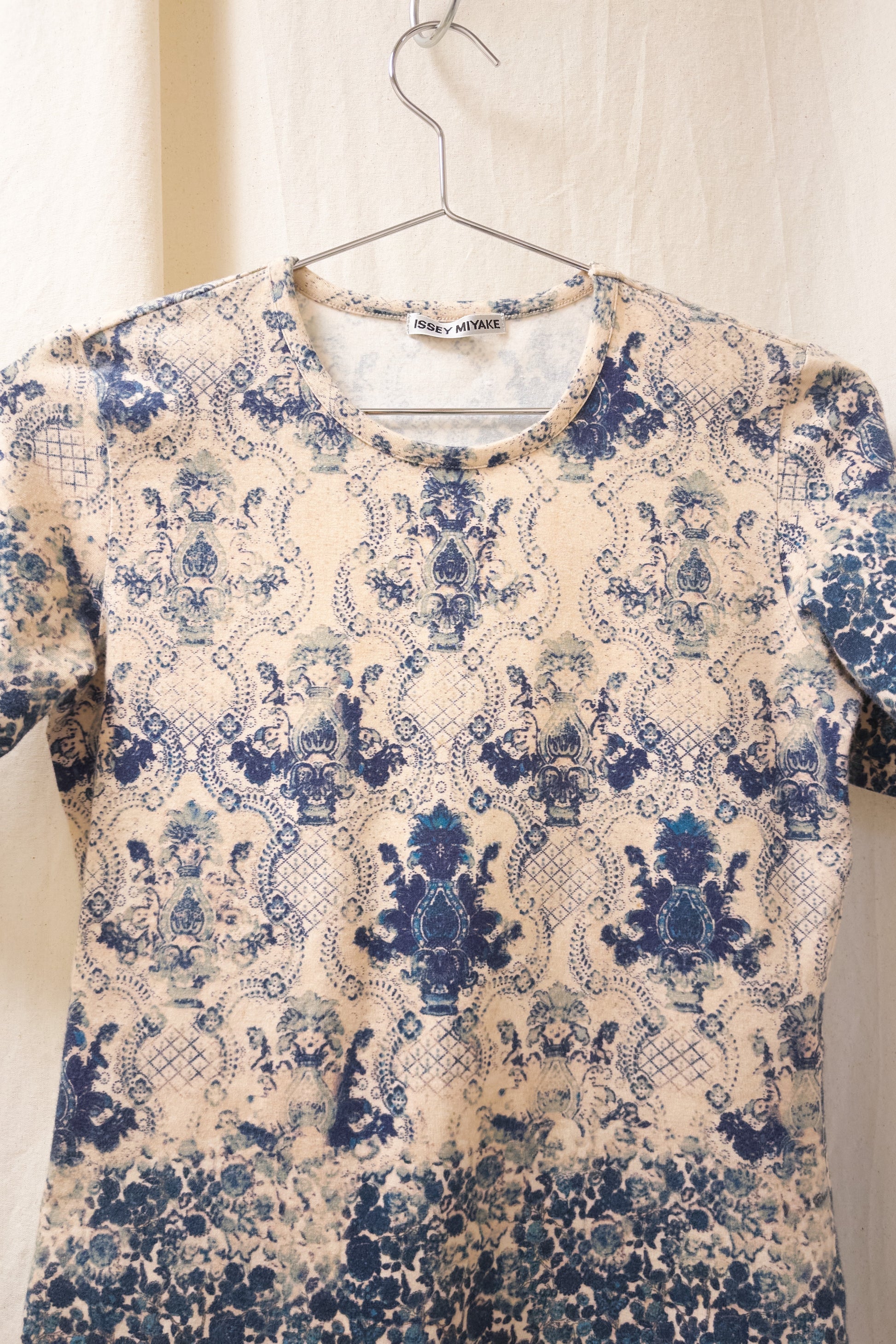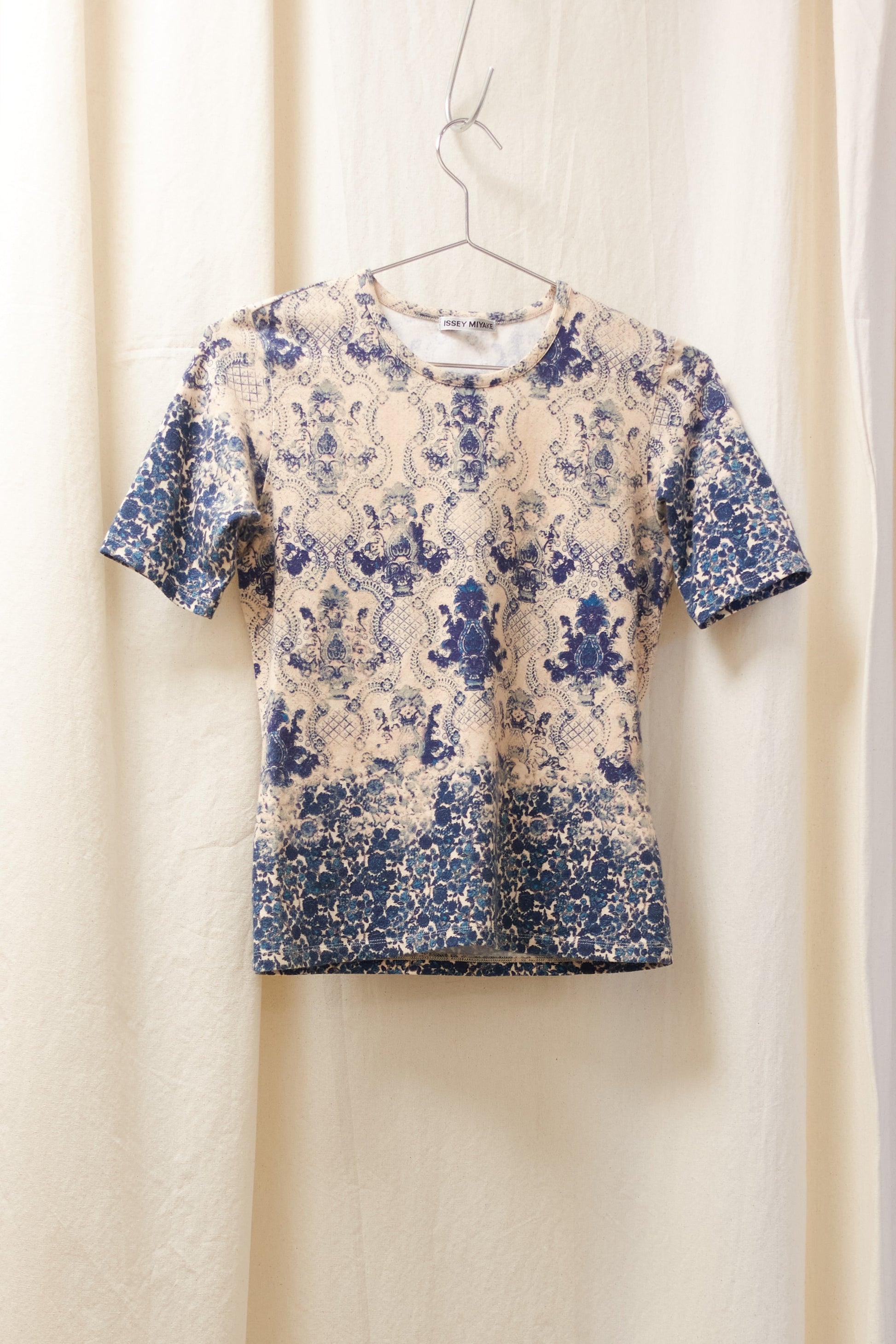 from Issey Miyake is this floral/ damask / vase print t-shirt. It looks to be an indigo dye. Fabric is a dense cotton-blend jersey, with significant stretch to fit.
