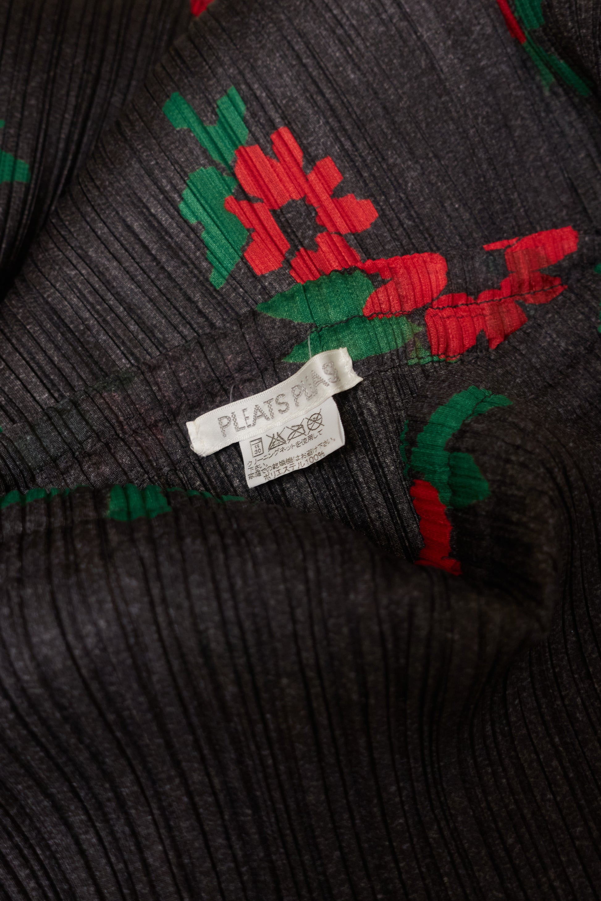 Issey Miyake Pleats Please grey skirt, with a pop green/ red floral motif print. The skirt has a centre front seam, with the pattern being ‘interrupted’ at points. The front panel flares out toward the hem with a bell like shape, with the back is cut straight. It has the classic pleats please micro pleat & elasticated waistband.