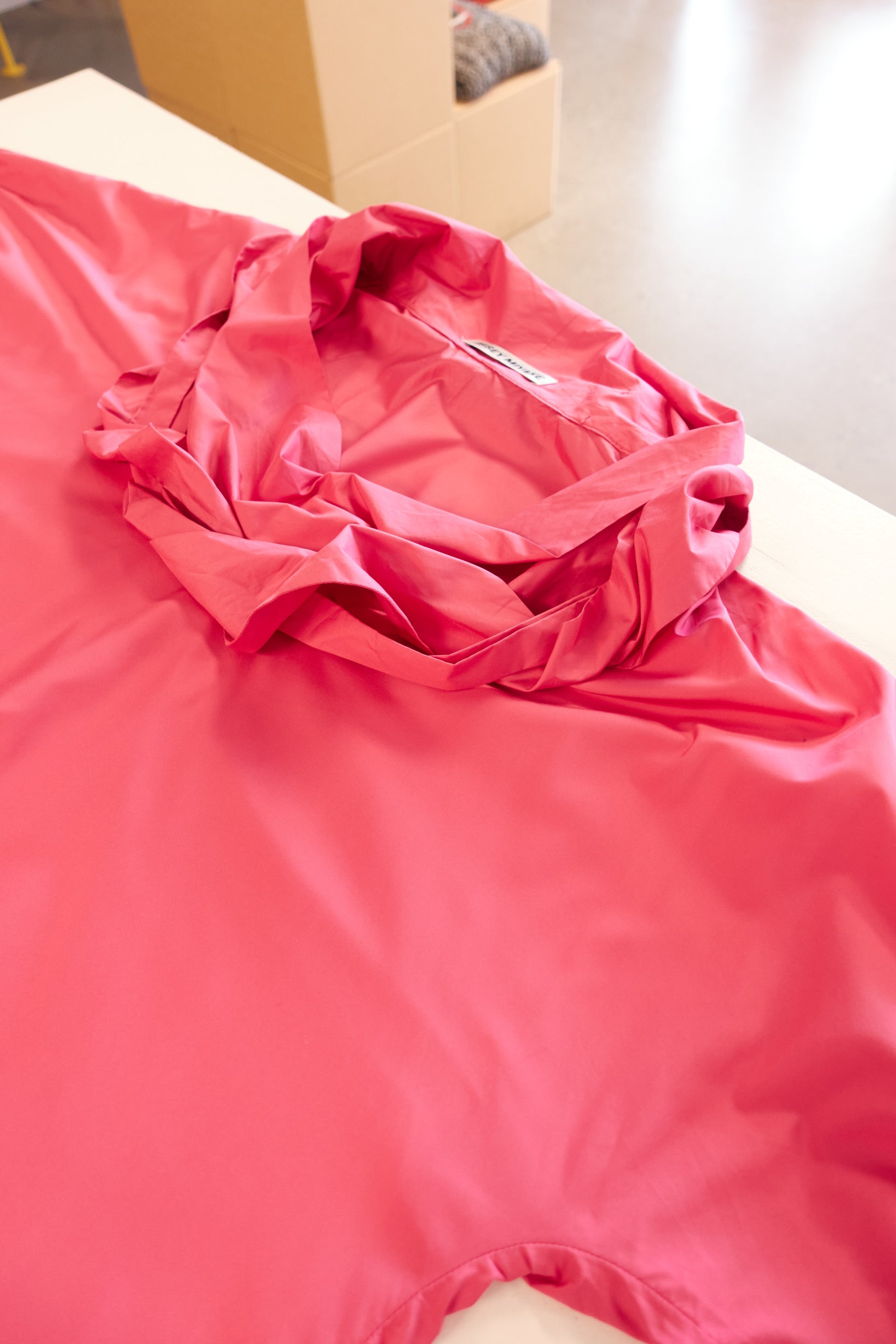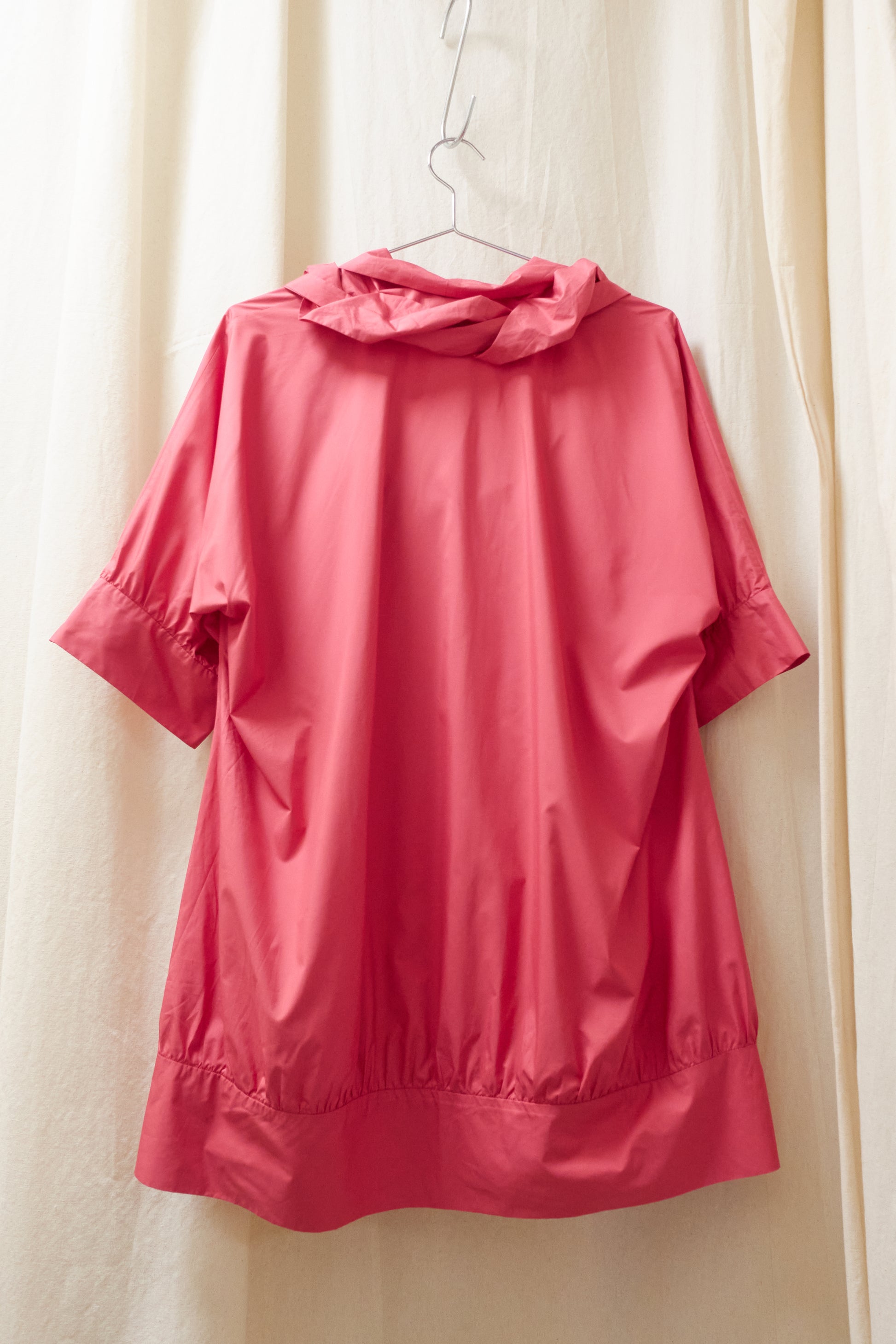 from Issey Miyake is this short sleeve top. It features a plait like weave detail on the neck, and is made from a very bright and slightly reflective pink polyester. It has a bat-wing like sleeve, with large hem & cuffs.
