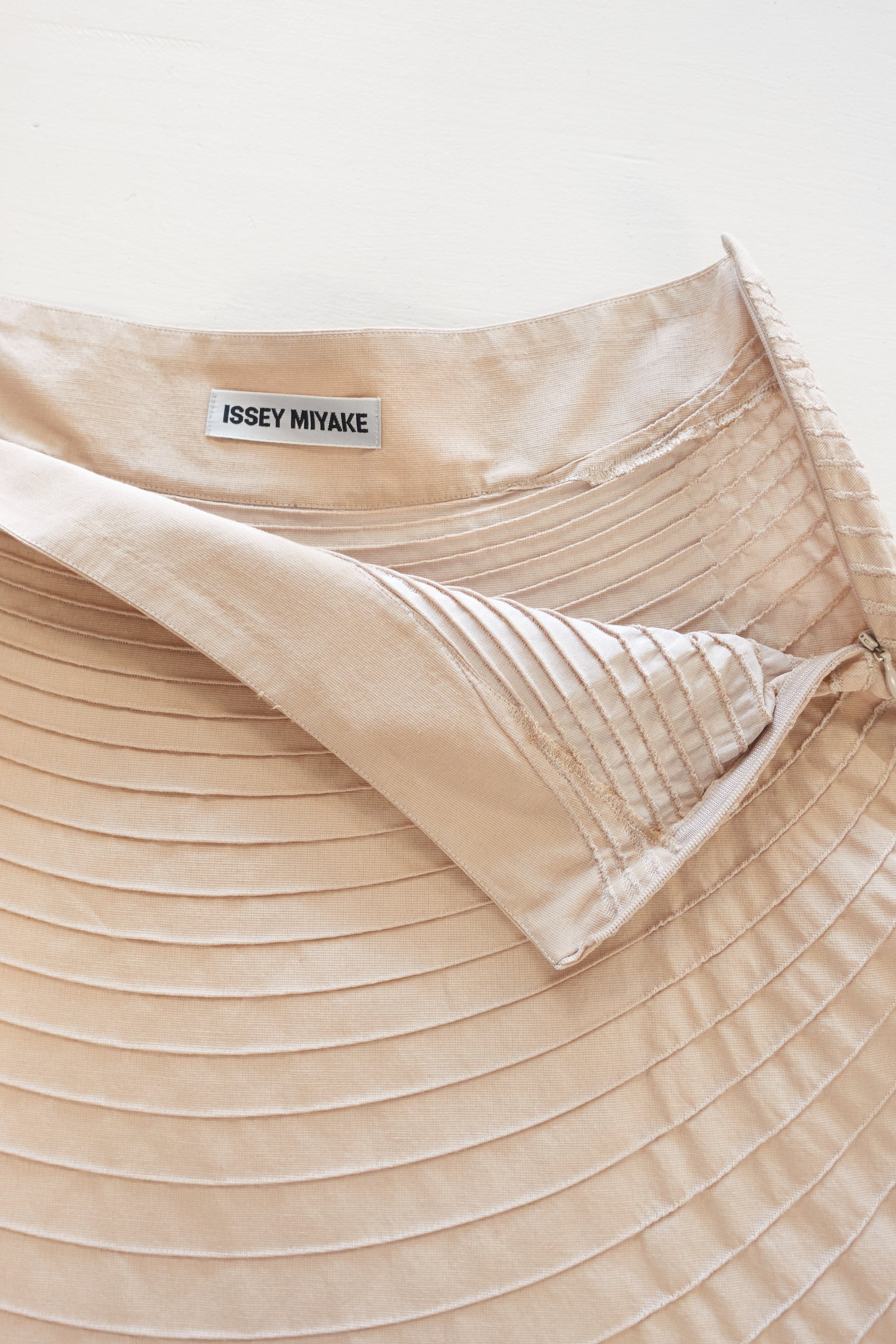 from Issey Miyake is this three-dimensional skirt. It has a uniquely woven fabric which results in the radial/wave pattern. In excellent vintage condition with no faults to mention.