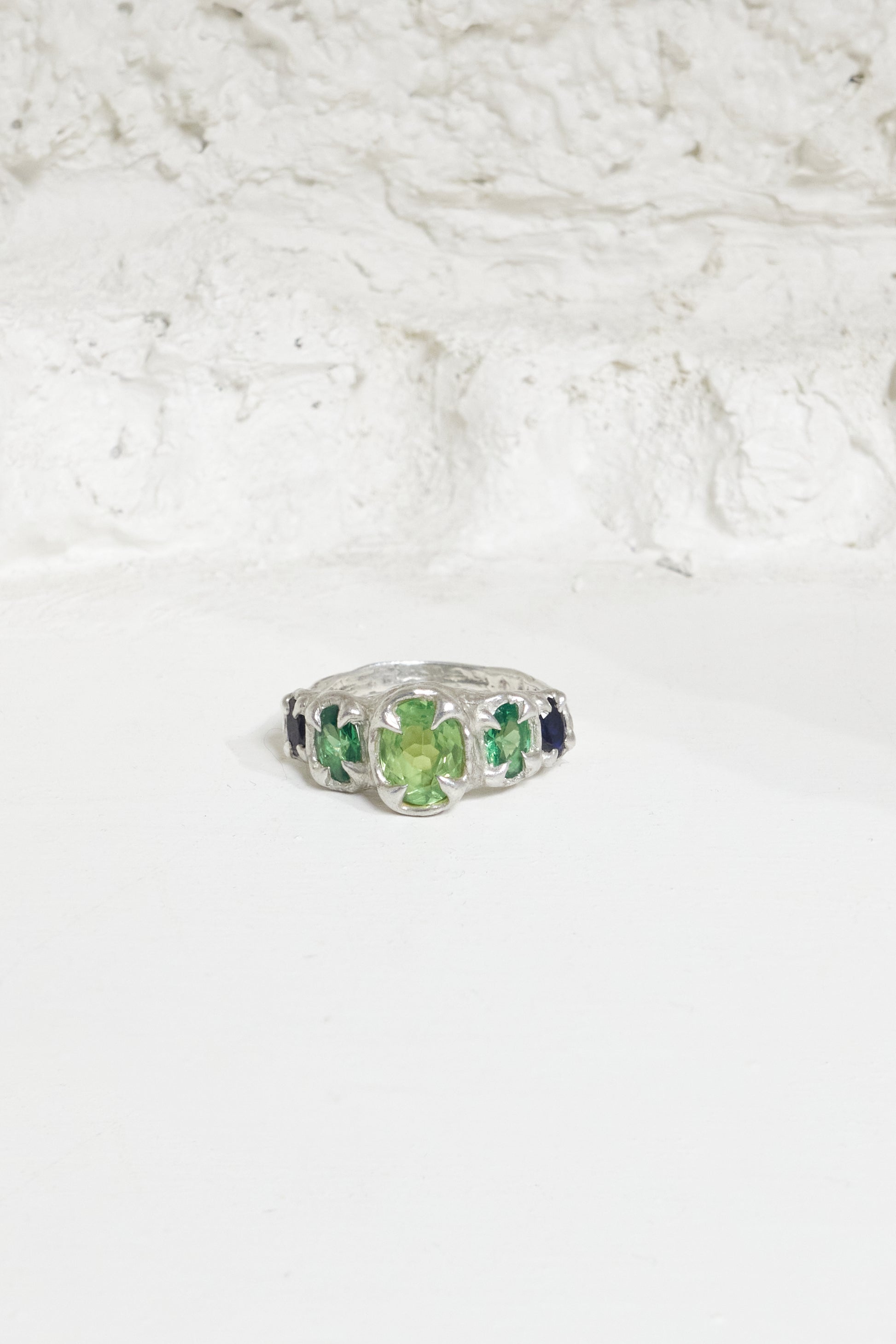 from Kaurna land (Adelaide) based jeweller Outcast is this 'celestial' ring. made from 925 silver with lab grown dark tsavorite and blue sapphire gemstones