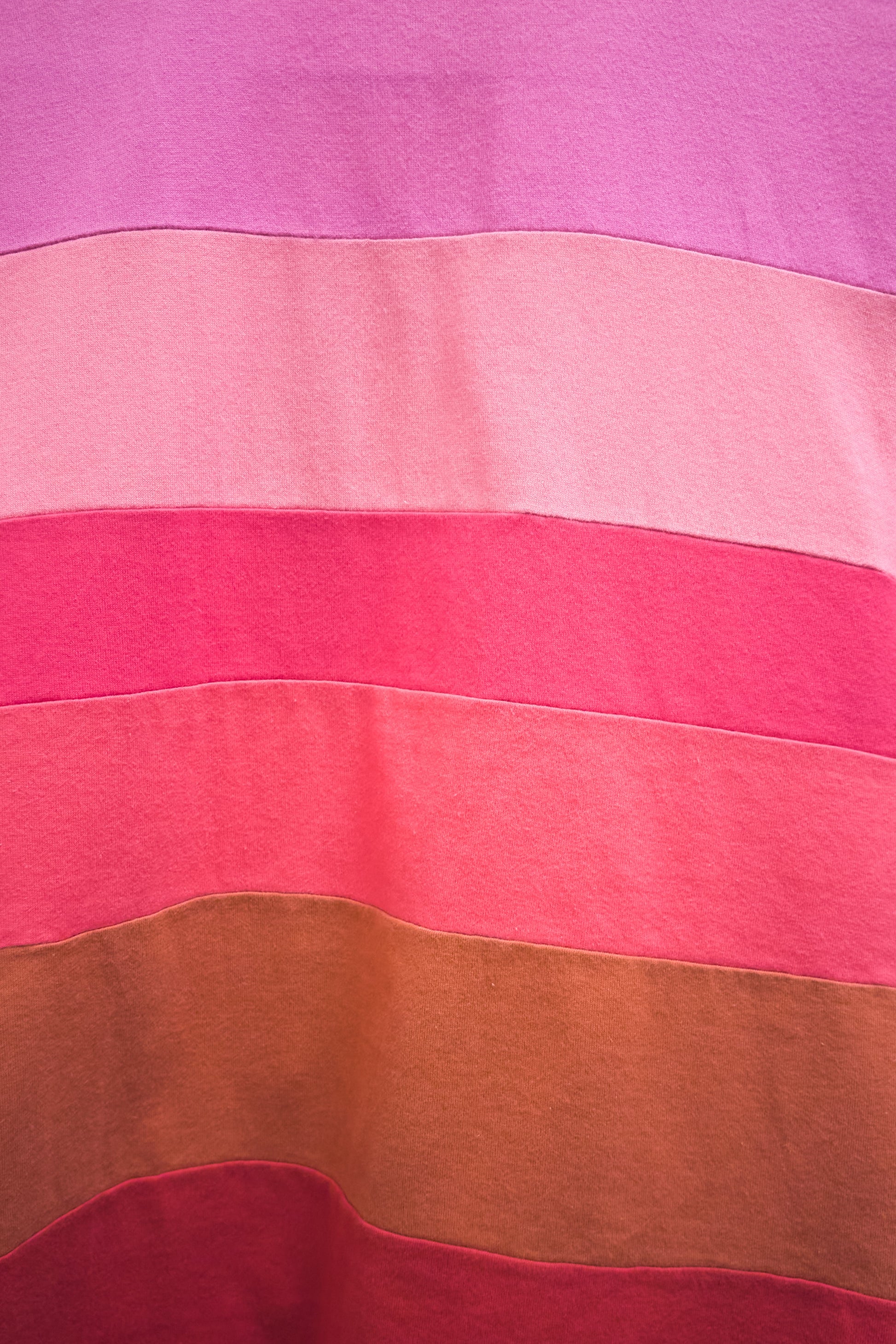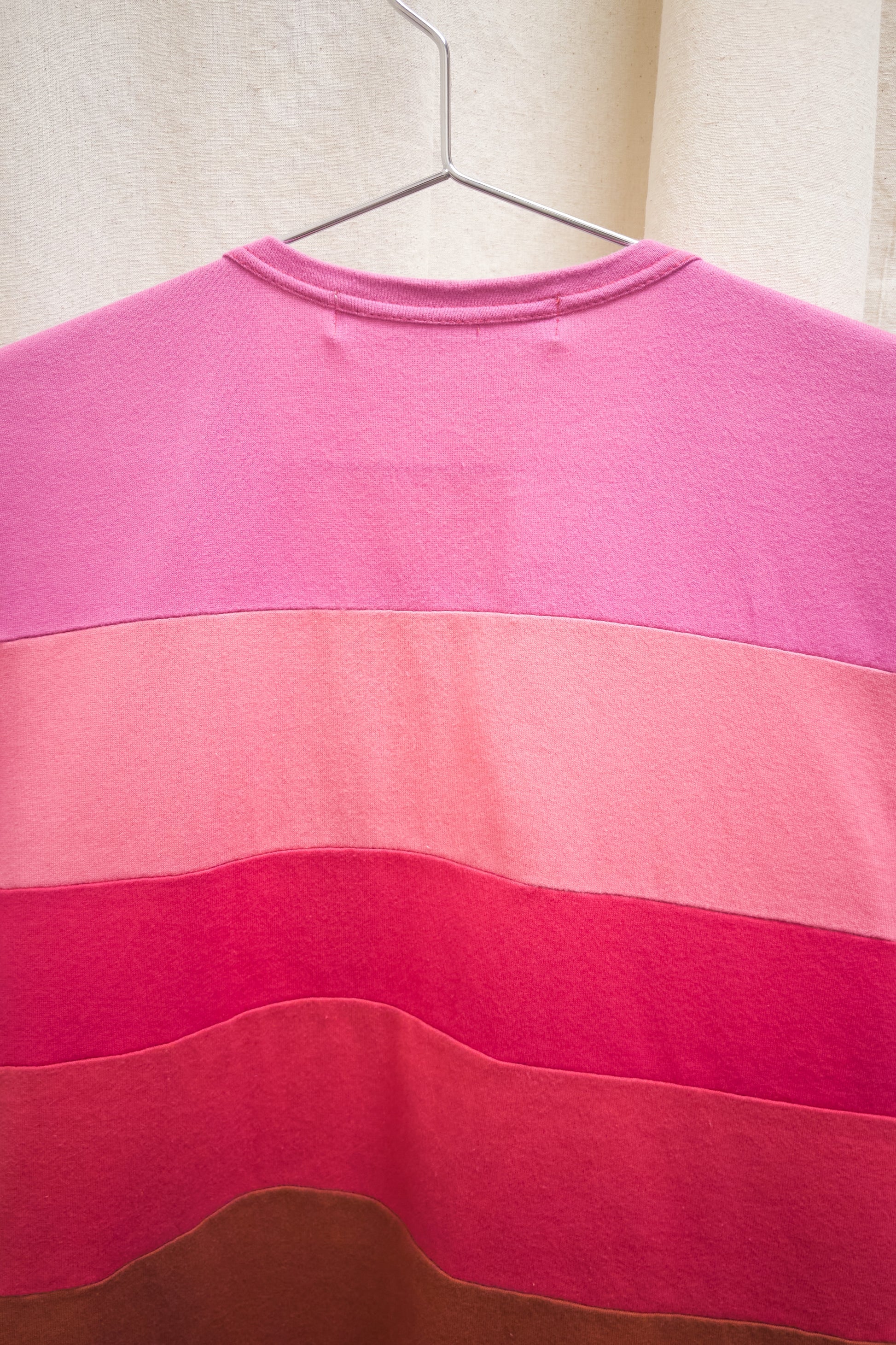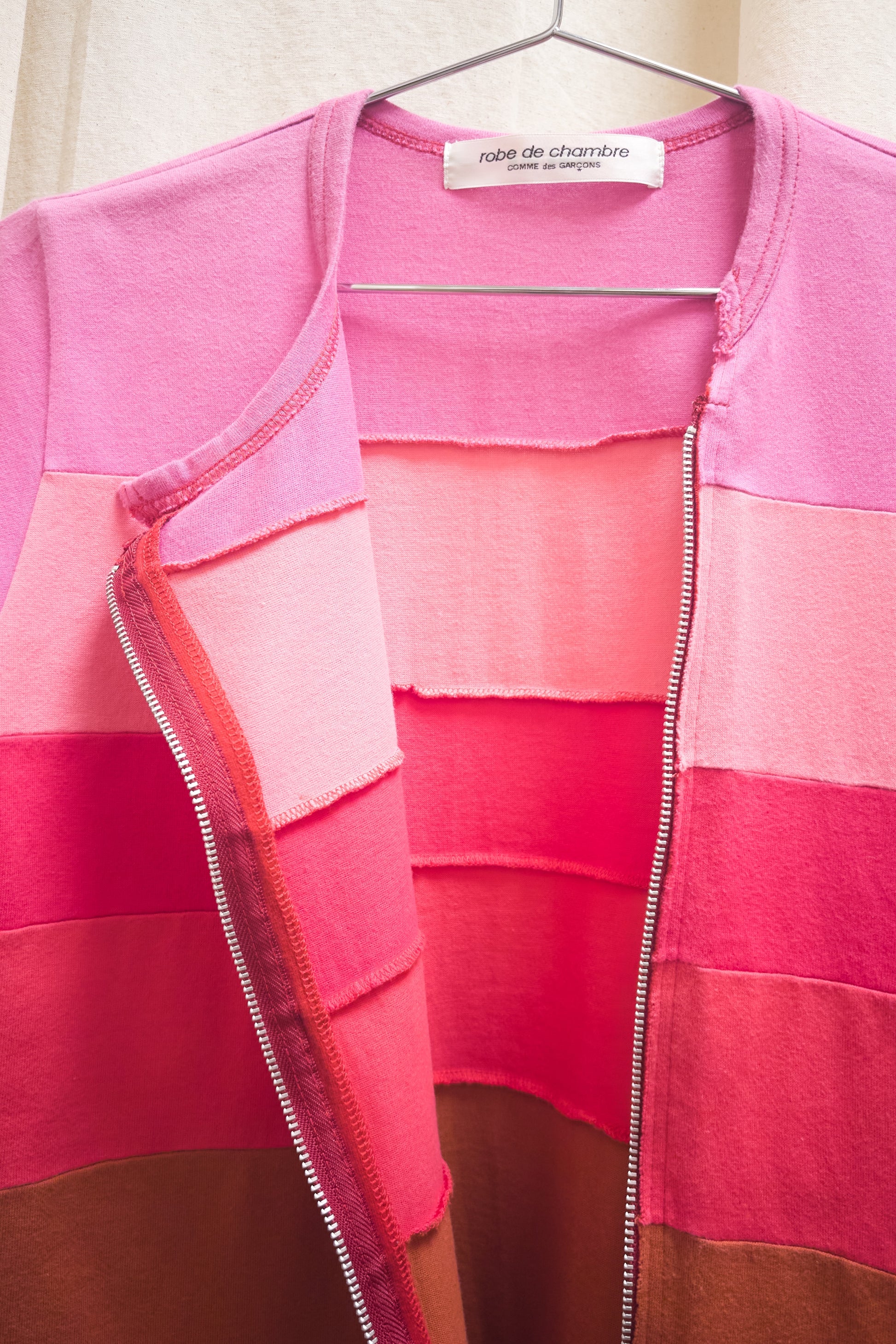 from Comme des Garcons' Robe de Chambre line is this striped/segment t-shirt with a dramatic zip closure at the front. It features pinks, reds and an ochre like colour way.
