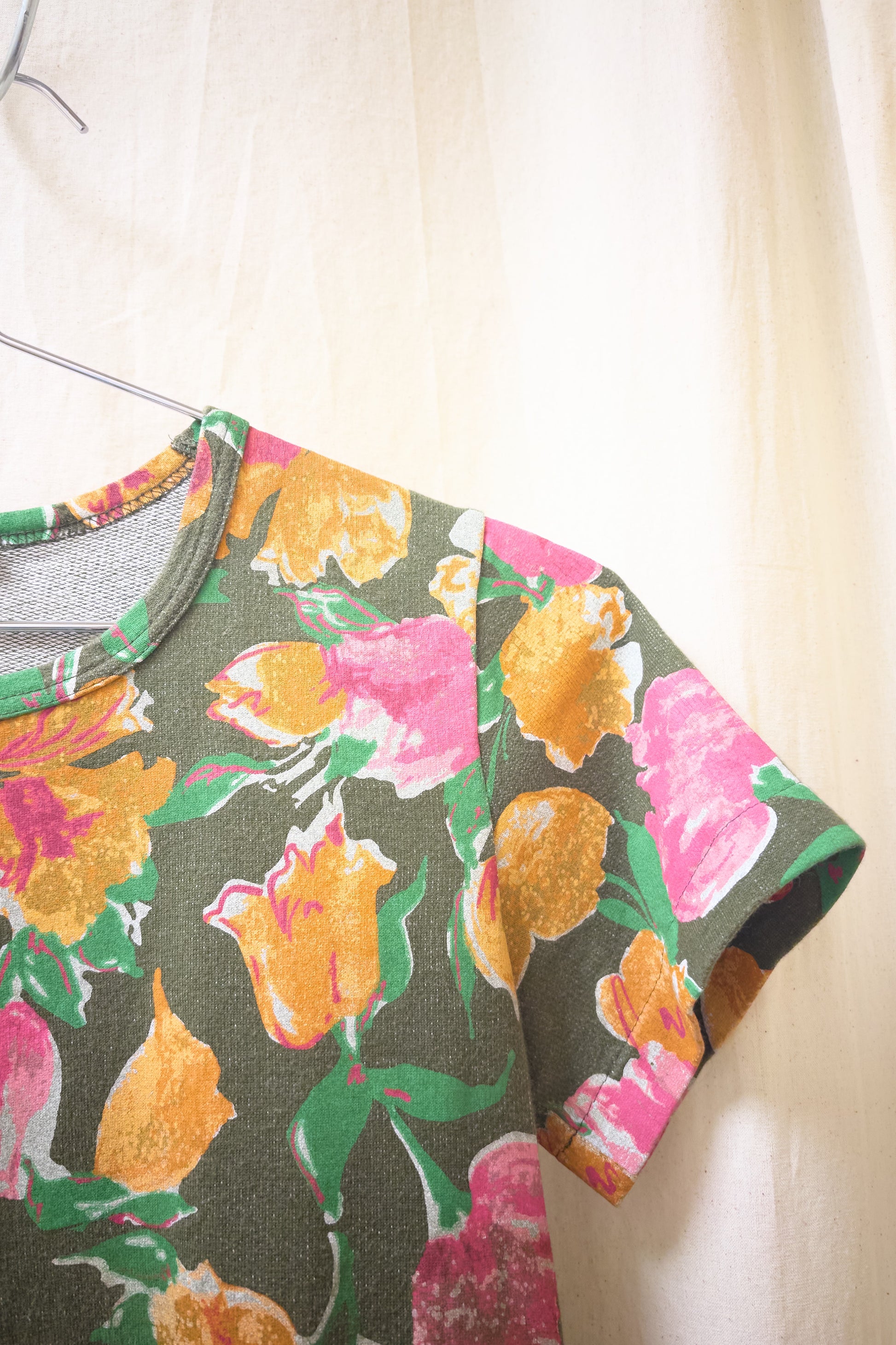 tricot comme des garcons floral t-shirt. It has a green base with a floral orange, pink and green print, which fades on the bottom section. from 2001, this top is In great vintage condition.