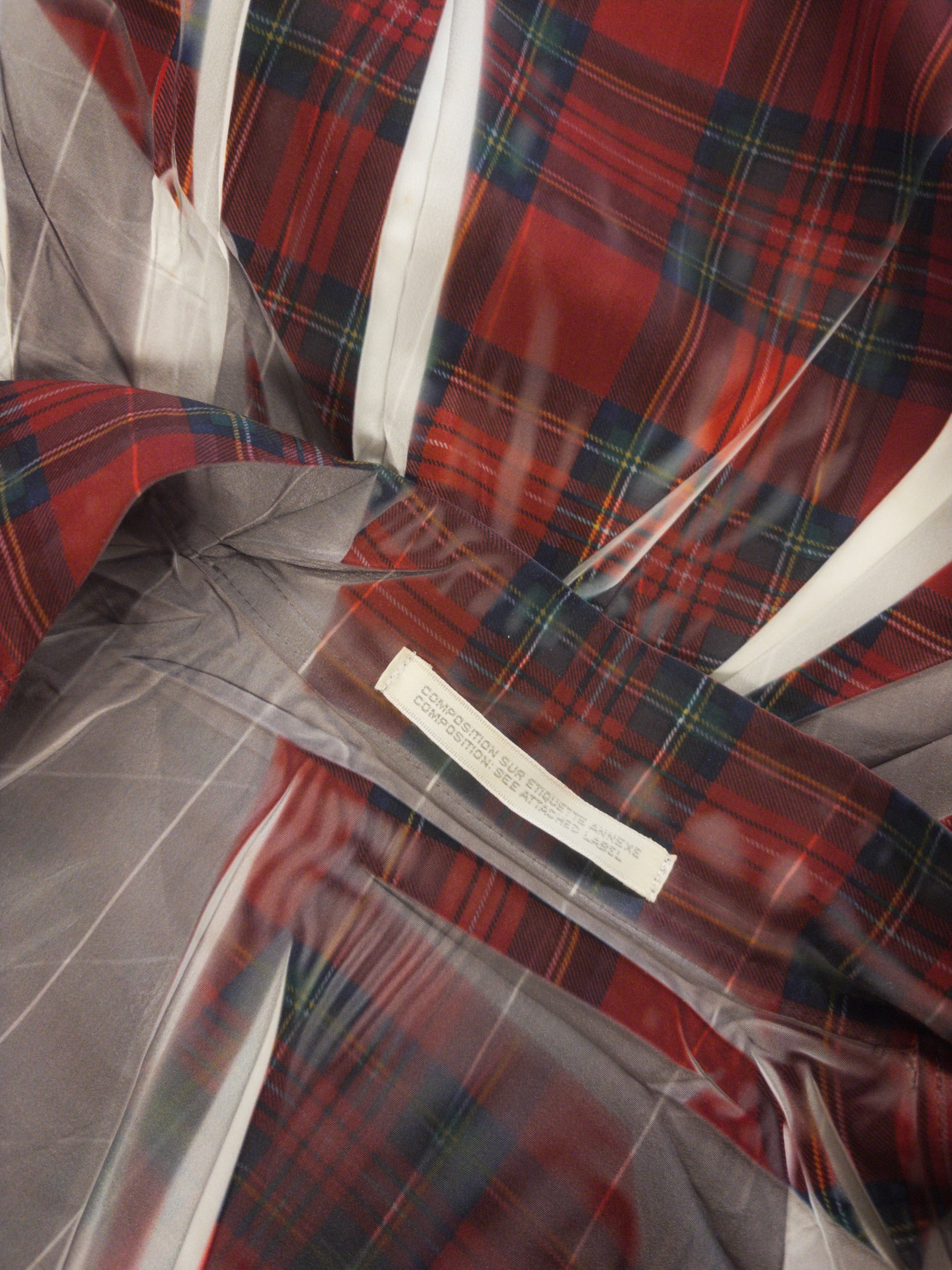 From Yohji Yamamoto Y’s is this crease plaid dyed jacket, featuring a plaid pattern which is printed over dramatic sharp ‘slice’ like creases. The jacket has multiple grey and white crease sections as well as two tones of plaid all over. It has two buttons at the front and open cuffs. In great vintage condition.